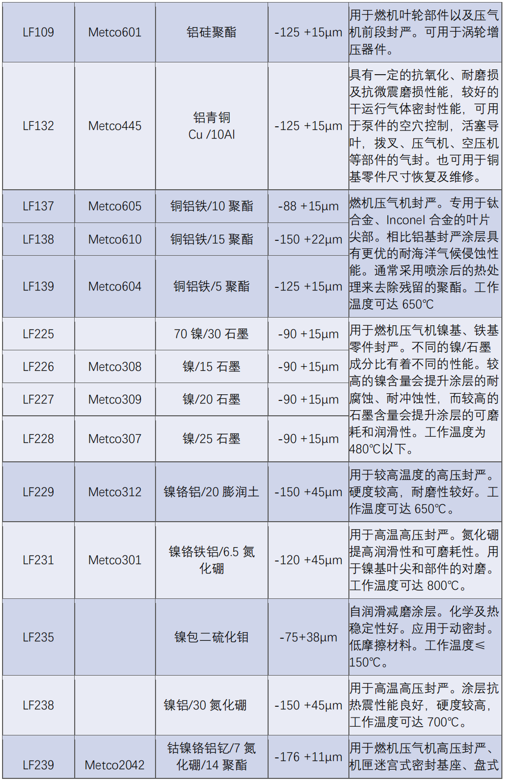 随后的几年中,北京联合涂层公司通过潜心研发不断扩充自己的封严涂层材料产品线,目前已推向市场的封严涂层解决方案包括以下种类的面层粉材、打底层粉材和打底层丝材: